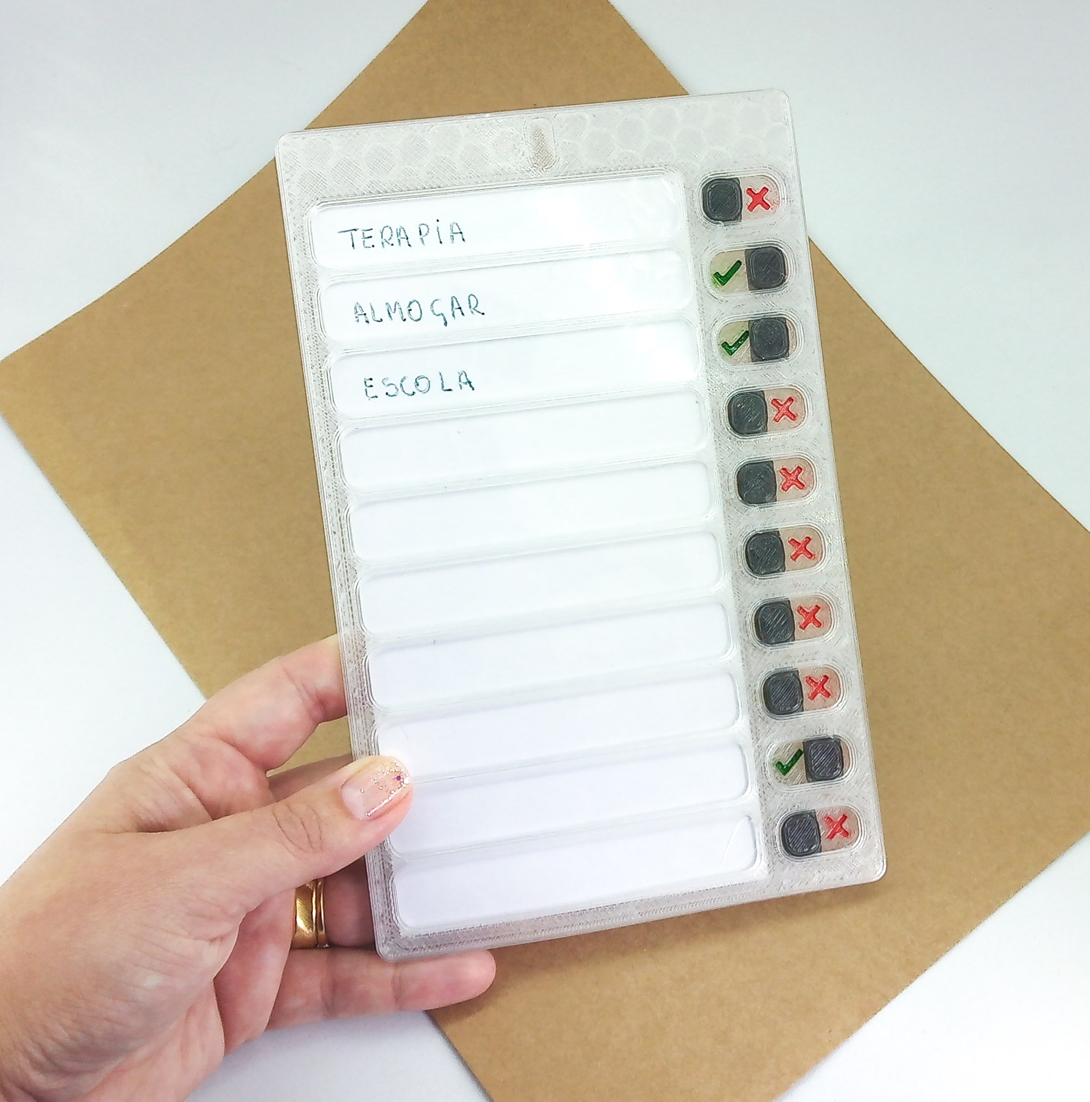 Podendo ser escrito diretamento no papel com caneta ou no acetato com caneta para quadro branco podendo ser apagado e modificando sempre que precisar.